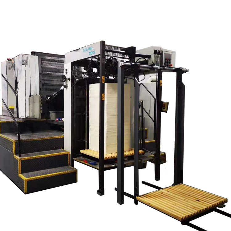 本公司開發(fā)生產(chǎn)了一種印刷機預裝紙裝置,適用于國內(nèi)外各品牌印刷機,用于印刷機進紙的可垂直升降的進紙托盤,其特征在于: 在印刷機進紙托盤上安裝導軌,進紙托盤上導軌與地面安裝的導軌對接,所述導軌和所述進紙托盤之間還設置一個垂直于所述進紙托盤的縱長的定位尺。新型的印刷機預裝紙裝置通過導軌可以精確定位小平板車,再通過定位尺對其上的紙張進行定位,從而快速準確地對小平板車上的紙張進行定位作業(yè)。本實用新型的印刷機預裝紙置具有結構簡單,高效,定位準確等優(yōu)點。